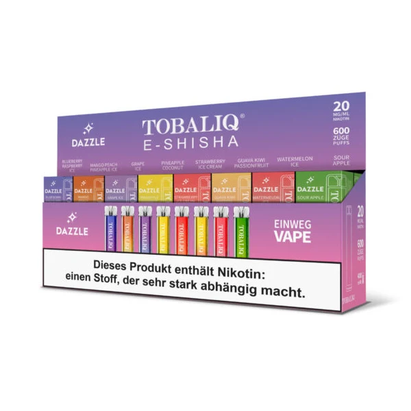 DAZZLE Einweg-Vapes strahlen in einem glänzenden Design und verführen mit ihrer eleganten und ergonomischen Gestaltung. Mit einem Nikotingehalt von 20mg/ml, 600 Zügen und Batteriekapazität von 400 mAh werden dir die DAZZLE Vapes langanhaltenden Genuss bieten.